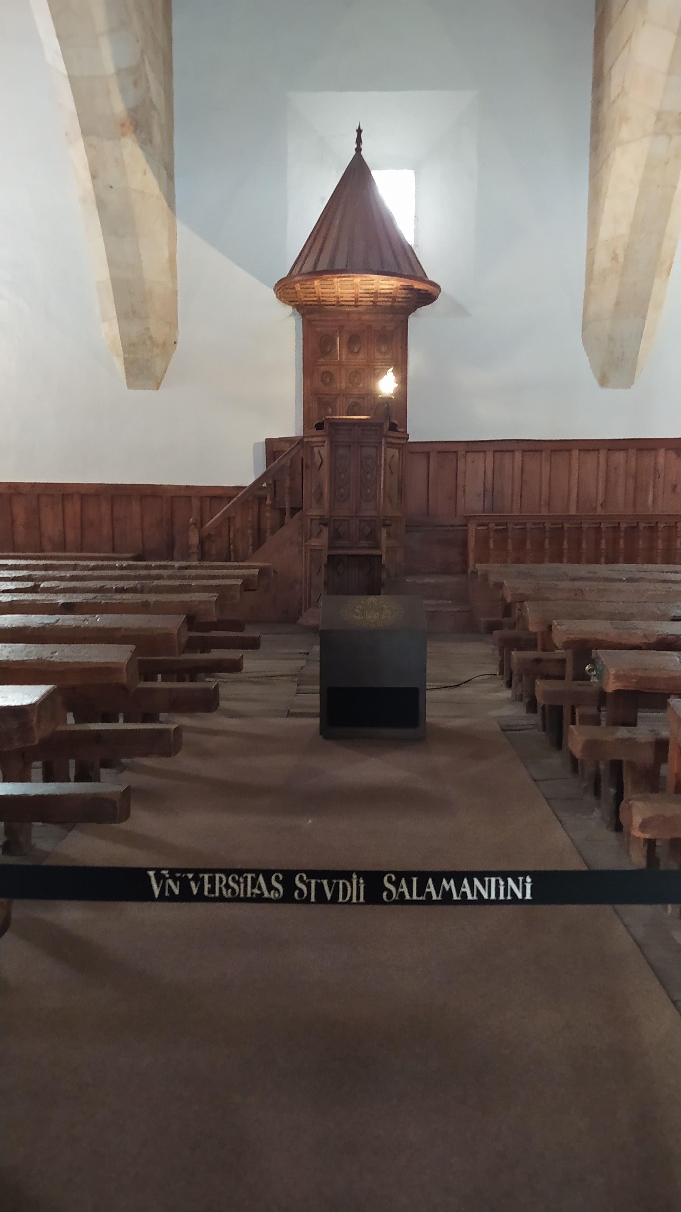 - Edificio histórico de la Universidad. Buscar la rana de su imponente fachada es tradición entre los turistas. El interior alberga , además de las antiguas aulas (entre ellas las de Unamuno y Fray Luis de León) y la biblioteca antigua, una pequeña sala (la Sala de la Columna) con interesantes objetos de orfebrería y arte religioso y un bello claustro, entre otros interesantes espacios. No hay que perder de vista los artesonados. Todo una museo.